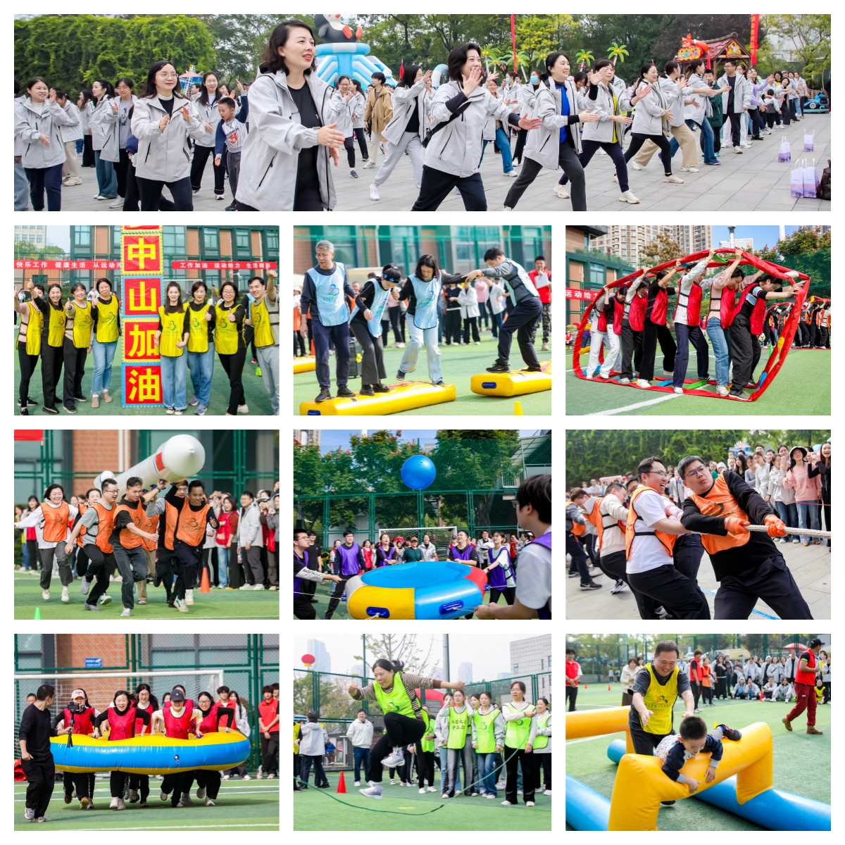 本次运动会,设传统类、趣味类和亲子类共九大比赛项目,包括集体跳绳、拔河、一飞冲天、步步高升、同舟共济、八仙过海、众星捧月、滚滚向前及挑战指压板(亲子项目),同时设有九宫射门体验项目,内容丰富,形式多样,兼顾竞技性与趣味性。